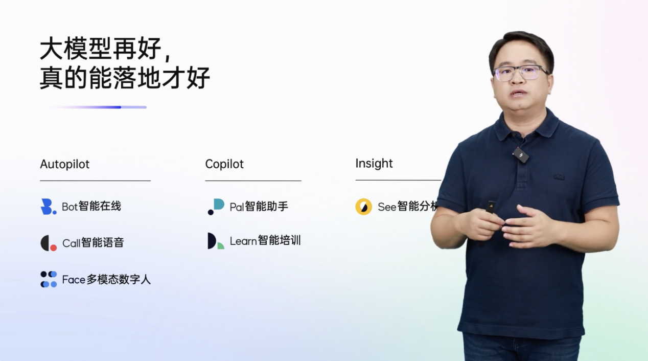 在发布会上,吴悦展示了基于博文领域大模型能力重塑的三类成熟的软件产品:可以直接和C端用户交互的Autopilot类,文本渠道的Bot、语音渠道的Call和多模态数字人Face;实时辅助B端员工提升服务水平,营销能力的Copilot类,分析企业大量的非结构化对话数据,挖掘商业价值的Insight类。这些产品涵盖AI自助服务、人工辅助、运营分析等多个环节,为企业提供一体化的AI员工解决方案。