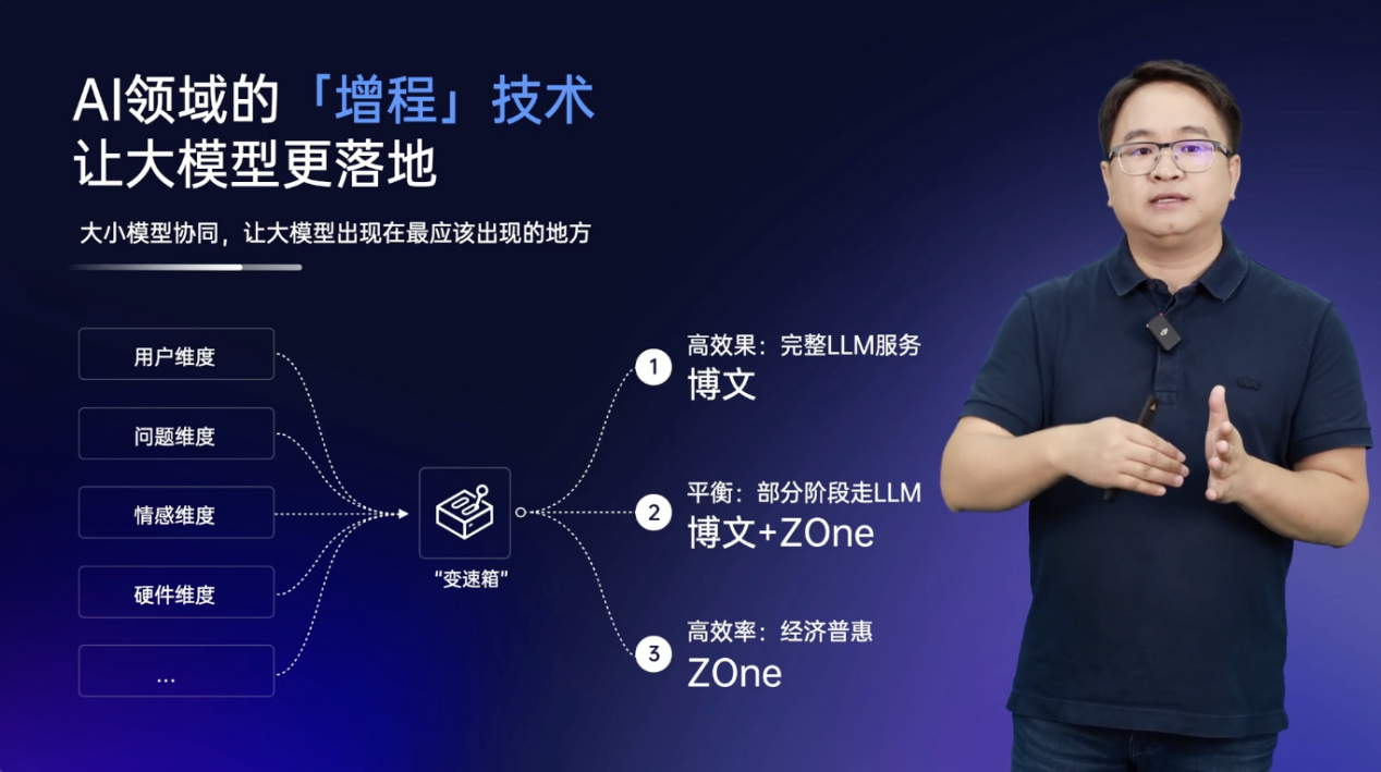 此外,追一科技针对客户普遍关注的大模型的成本问题,提出了“增程”技术理念,具体来说,就是通过大小模型协同,共同支持客户需求,通过一个“变速箱”组件,根据用户或者实际处理任务的不同,来做动态配置和组合,让大模型出现在最应该出现的地方,提升模型效果的同时,实现了性价比最大化。