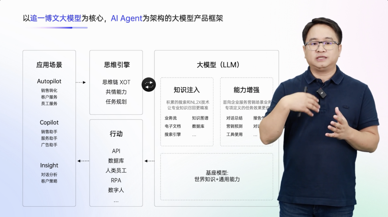 在博文领域大模型的构建时,除了大模型基础的通用能力外,追一通过NL2X等技术准确将企业知识融入,并针对与客户场景强相关的,如对话分析、对话交互等专项能力进行加强,以便达到更好、更稳定的最终业务效果。在博文领域模型之上,追一研发了一套AI Agent框架,一方面能把大模型思维链的能力充分发挥出来,另一方面更好实现最终模型输出结果的“可控”。