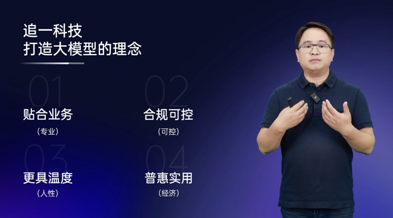 追一科技围绕四个理念打造大模型:贴合业务、合规可控、更具温度、普惠实用。第一点是要求大模型要足够专业、贴合客户业务;第二点是满足企业客户对于合规可控的高要求;第三点是在面向 C端提供服务时,AI员工能敏锐响应客户的情绪,更“通人性”;最后就是落地性,只有普惠实用,客户才能真正用得起来。